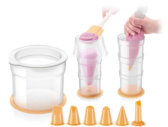 Conjunto moldes para gelados com cones rosa e acessórios de cores branca e laranja