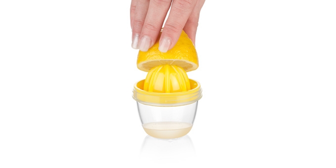 • Espremedor de citrinos amarelo e transparente com uma mão a espremer um limão
