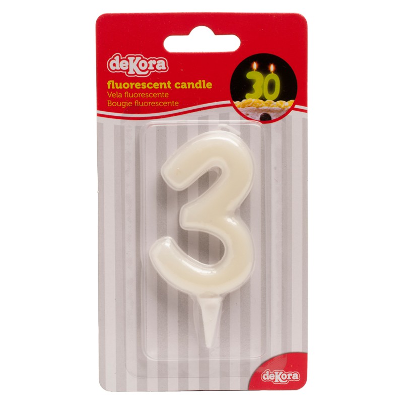 • Vela branca em forma do número 3 em embalagem de cartola com fundo riscado e cabeçalho vermelho.