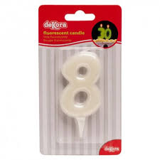 Vela fluorescente número 8 em embalagem blister transparente com fundo vermelho e branco