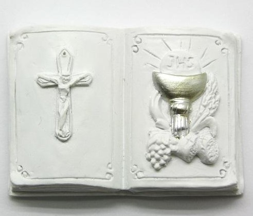 Escultura em relevo de livro aberto com crucifixo e cálice dourado