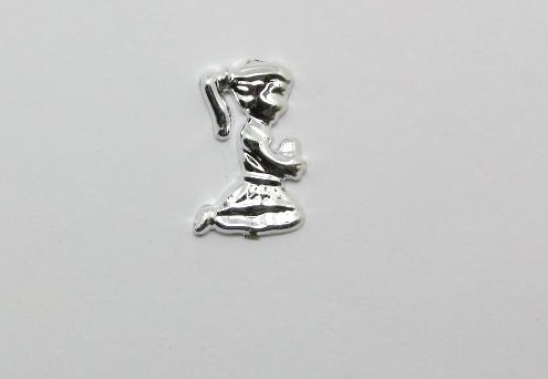 Pingente prateado de figura feminina ajoelhada em fundo branco