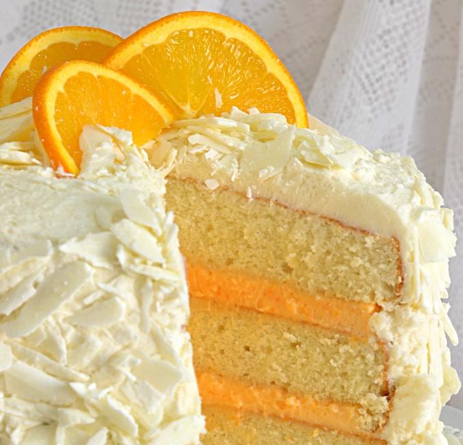• Bolo decorado com raspas de chocolate branco e fatias de laranja