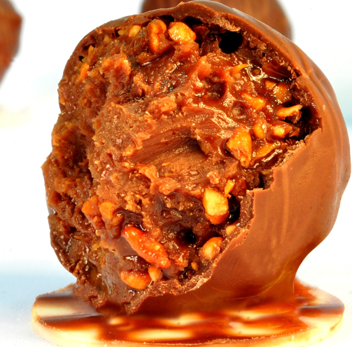 • Bombom de chocolate ao leite com recheio cremoso e pedaços de nozes