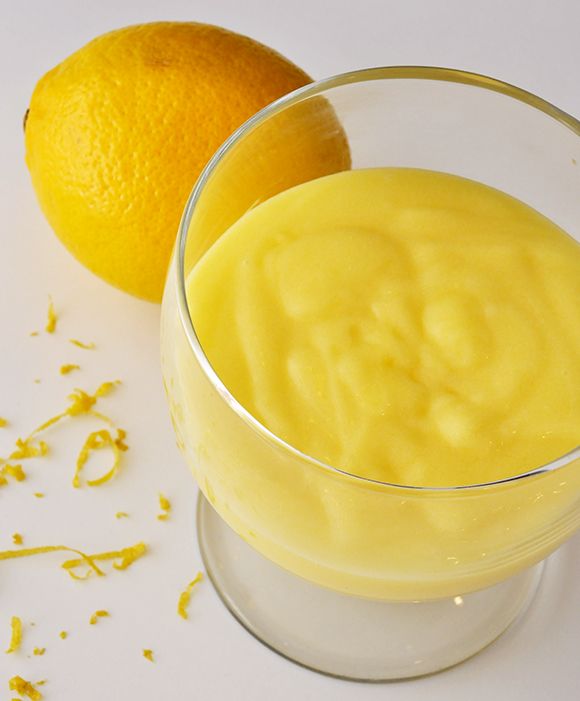 • Taça com creme amarelo e limão ao lado sobre fundo branco