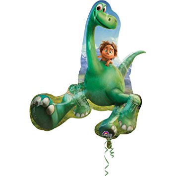 • Balão em forma de dinossauro verde com menino sentado nas costas.