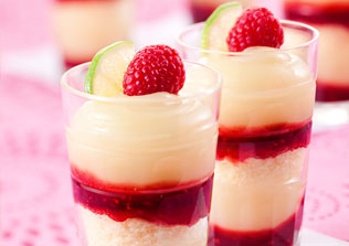 • Dois copos de vidro com doce em camadas decorado com framboesa e lima