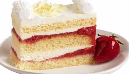 • Fatia de bolo com recheio de morango e chantilly num prato branco com morango.