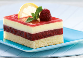 • Fatia de bolo com camadas vermelha e branca, decorada com limão e framboesa