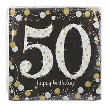 Guardanapos de papel pretos com número 50 dourado e branco e texto happy birthday