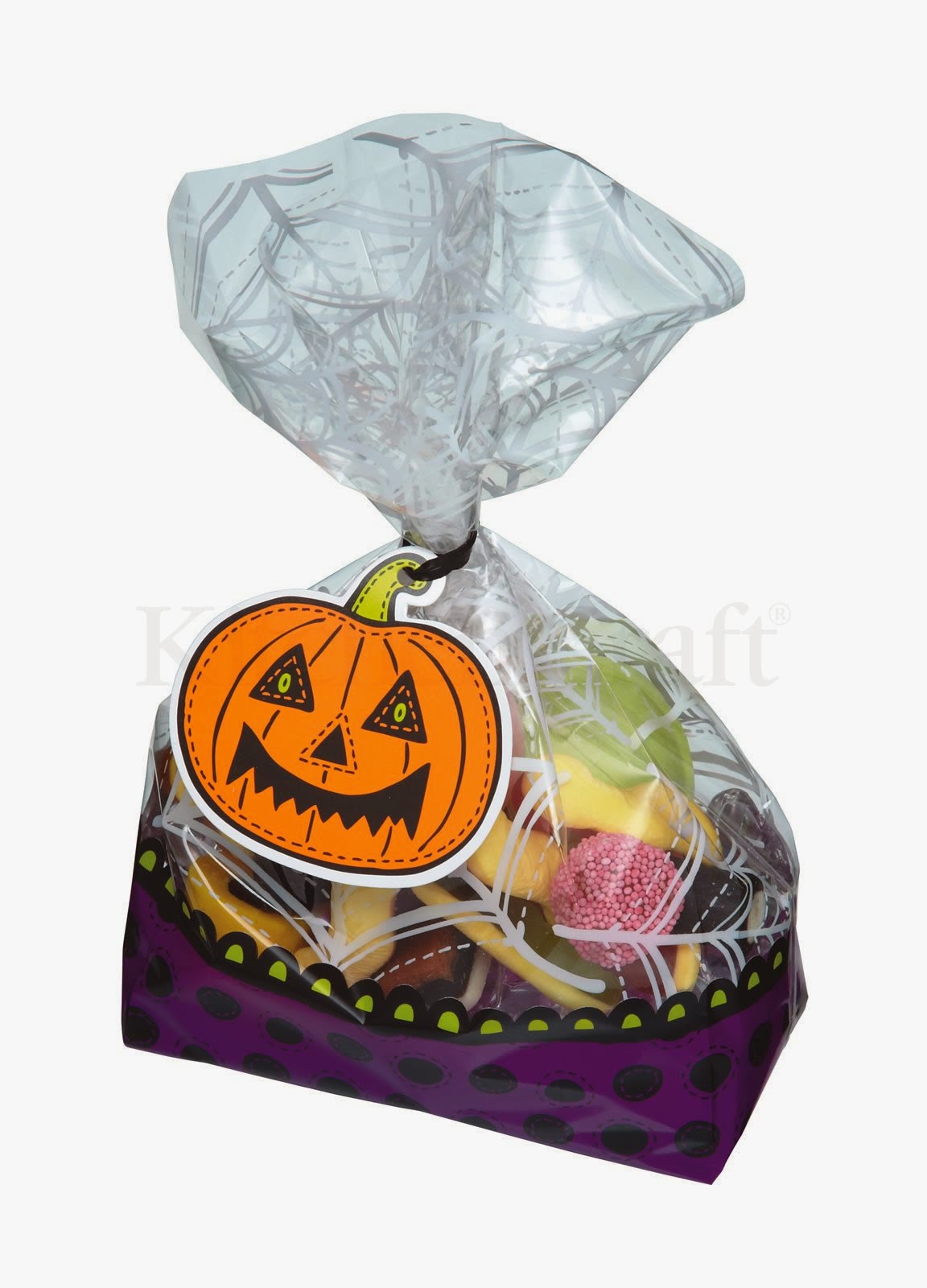 • Saco de doces de Halloween com decoração de teias e etiqueta de abóbora