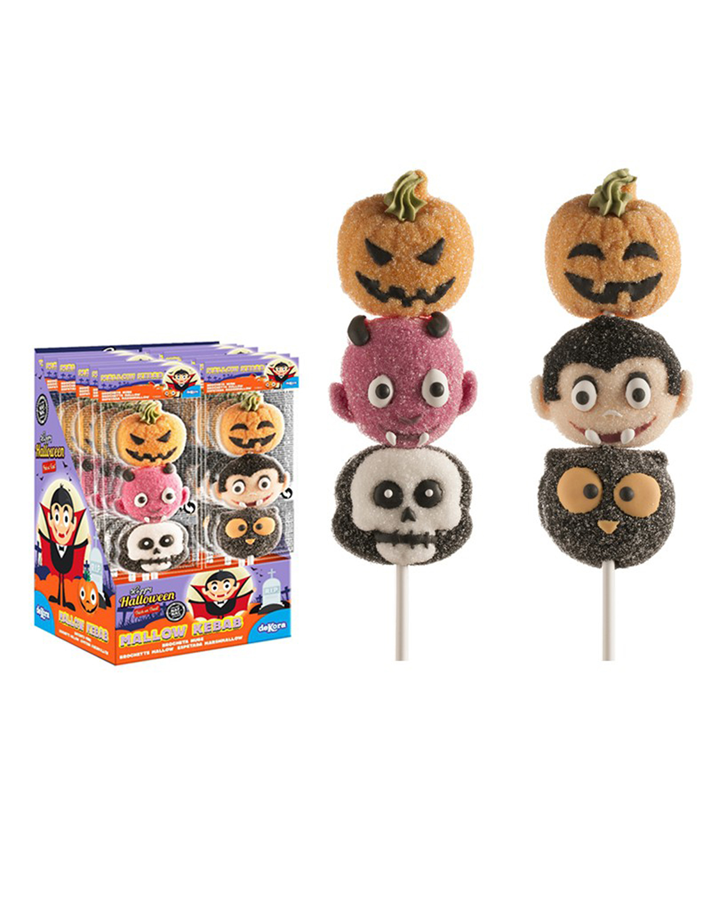 • Pirulitos temáticos de Halloween com abóboras, caveiras e personagens, embalagem colorida com vampiro.