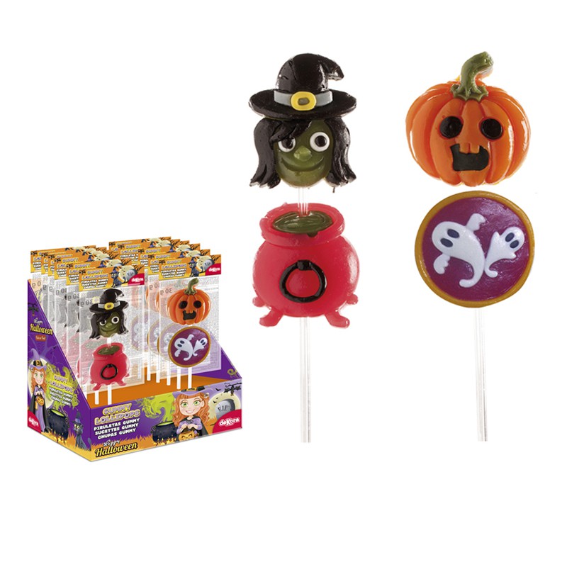 • Rebuçados de Halloween em palito com bruxa, abóbora, caldeirão e fantasmas, embalados e expostos em caixa