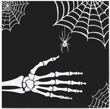 • Imagem de mão esquelética branca e teias de aranha brancas sobre fundo preto