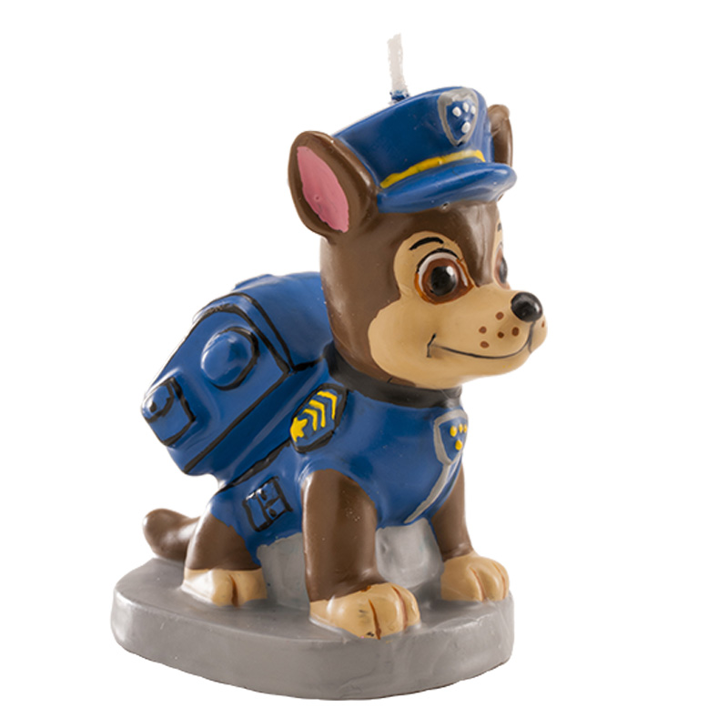 • Vela em forma de cão de cartoon com uniforme de polícia azul