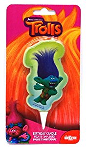 Vela de aniversário com figura de um troll azul em embalagem rosa e laranja com texto Trolls