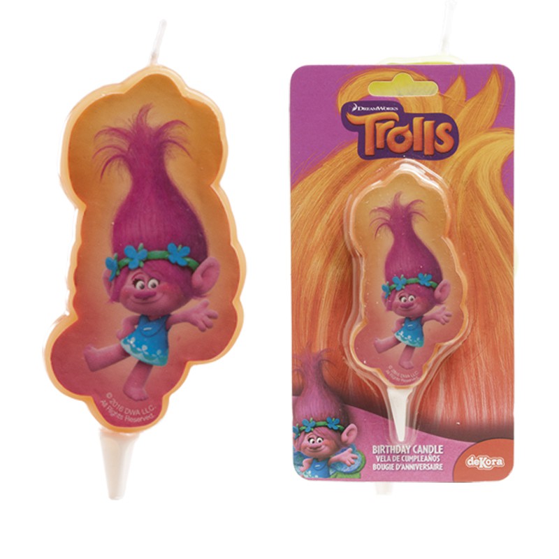 • Vela de aniversário dos Trolls com personagem rosa e azul embalada em cartão roxo
