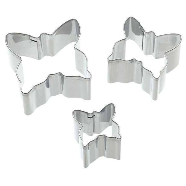 Conjunto de três cortantes em metal prateado com formato de borboleta