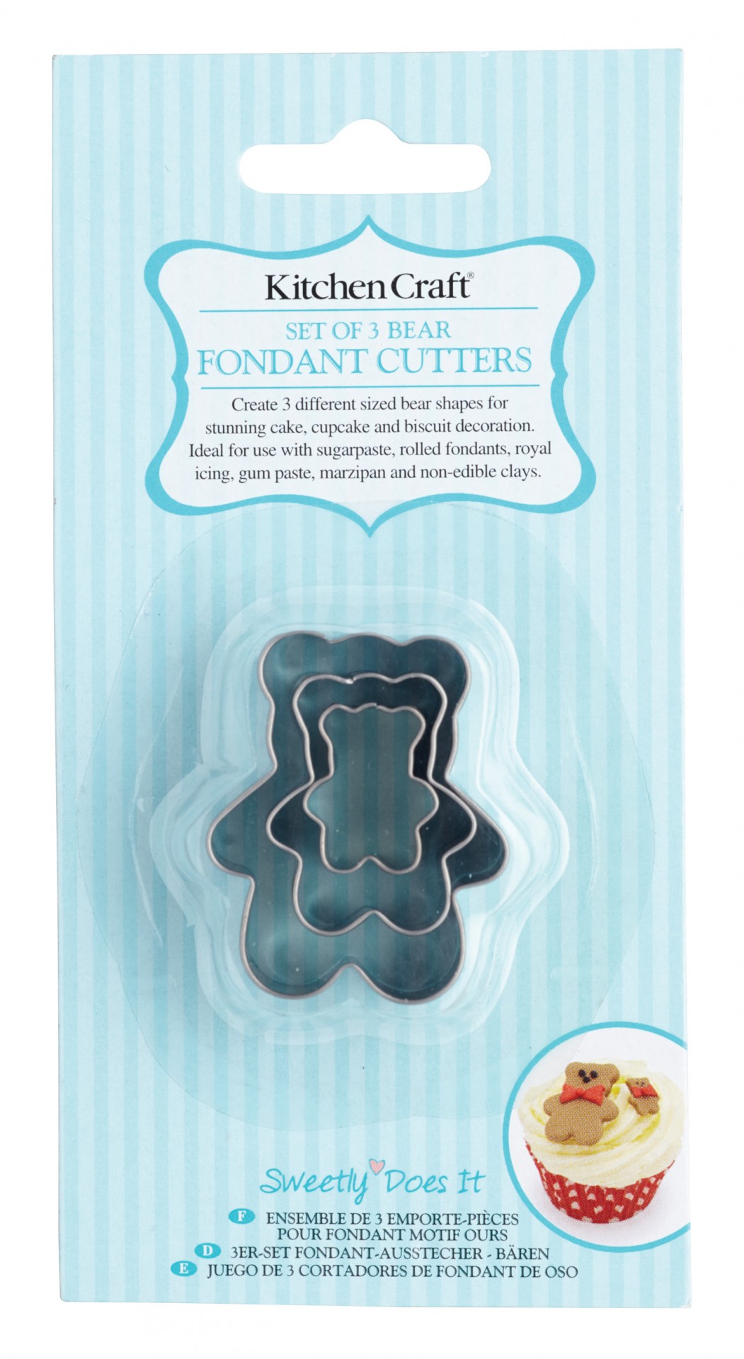 Conjunto de 3 cortadores de urso para fondant em embalagem azul claro