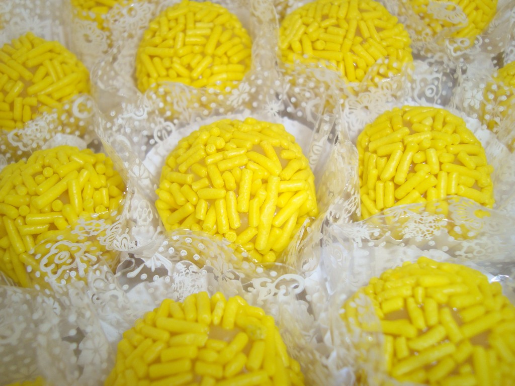 • Doces redondos com granulados amarelos em forminhas rendadas brancas