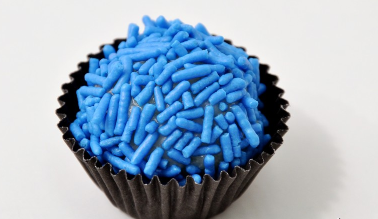 Doce com granulados azuis em forma de bolinha numa forma preta