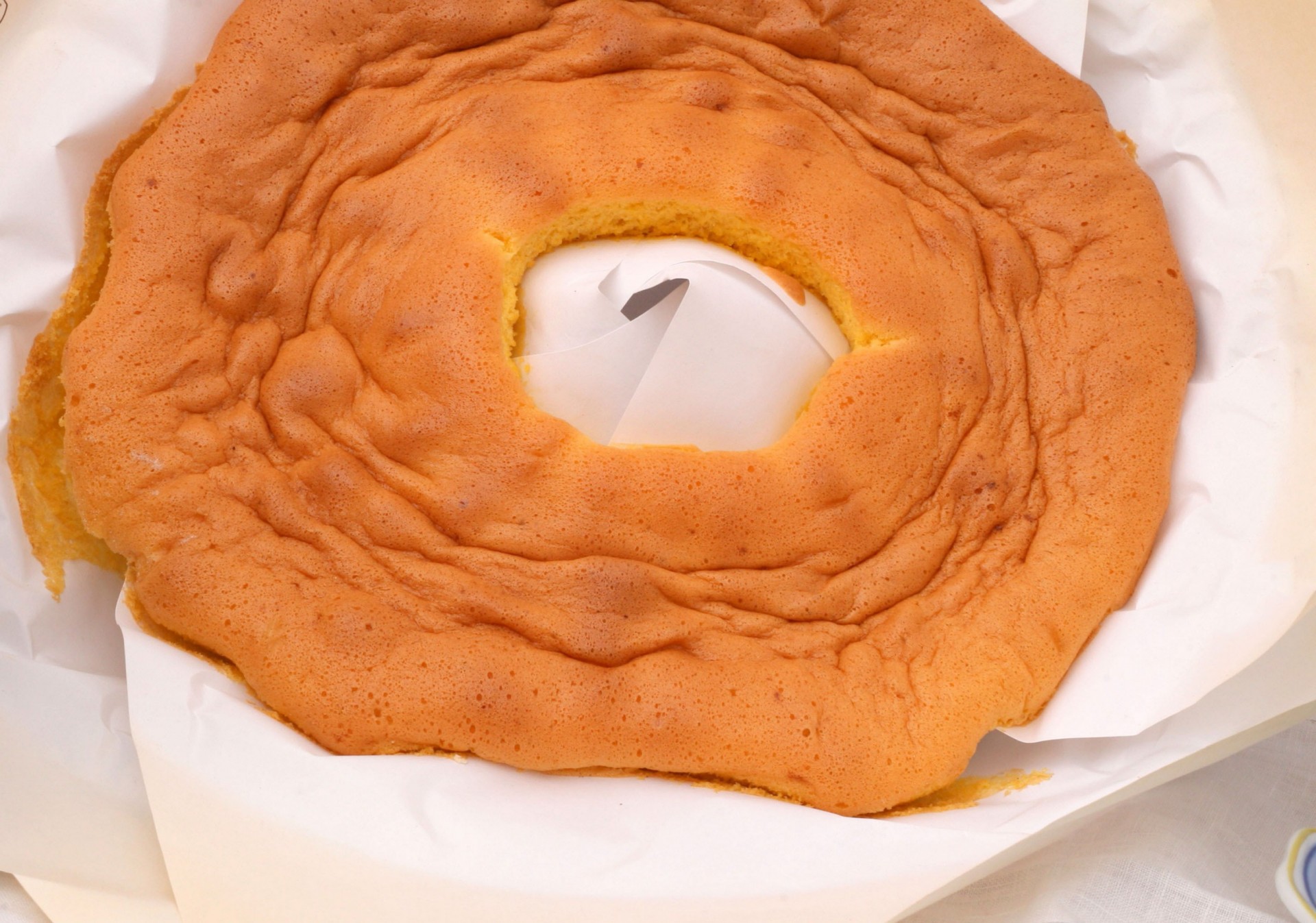 • Bolo tipo rosquilha laranja claro sobre papel branco.
