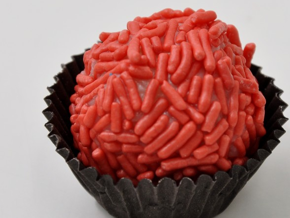 • Doce brigadeiro com granulados vermelhos em forminha preta