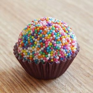 • Doce redondo com bolinhas coloridas em forminha de papel marrom