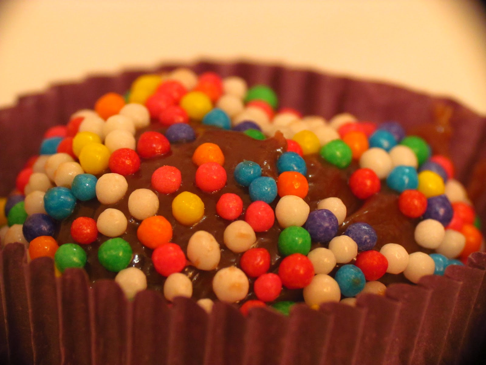 • Doce com confeitos coloridos em forminha de papel roxa