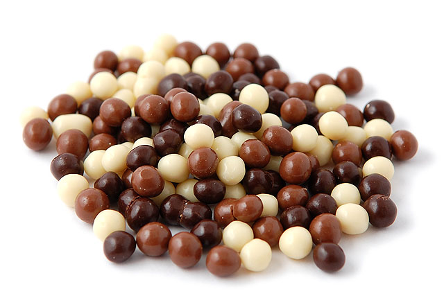 • Esferas de chocolate em três cores diferentes sobre fundo branco
