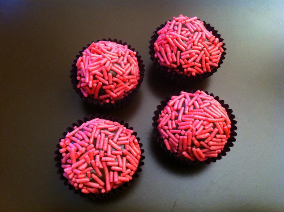 • Cupcakes com cobertura de granulado rosa em forminhas pretas