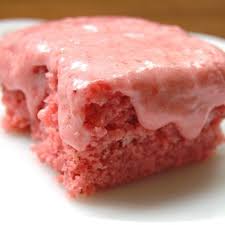 Bolo quadrado cor-de-rosa com cobertura cremosa da mesma cor no prato branco
