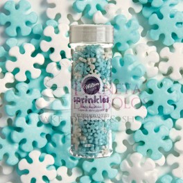 Frasco de confeitos Wilton em formato de floco de neve azuis e brancos