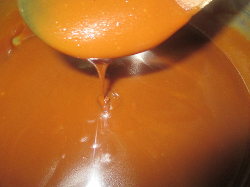 Substância castanha espessa a escorrer de uma espátula laranja num recipiente metálico