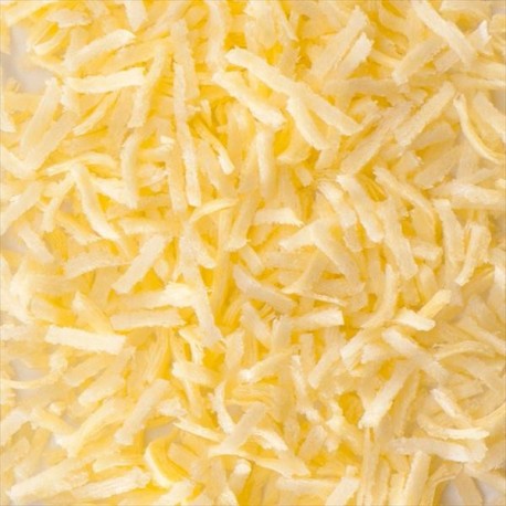 • Queijo ralado amarelo claro e branco com textura fina e irregular