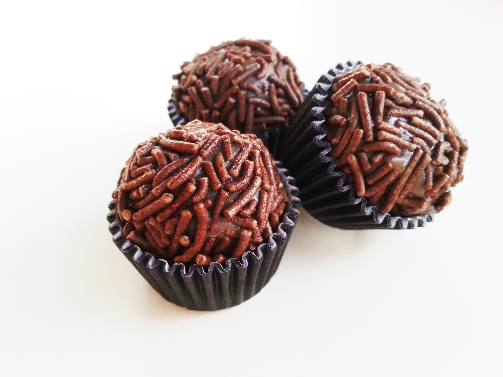 • Tres brigadeiros com granulados de chocolate em forminhas pretas