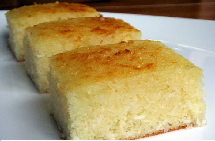 Três quadrados de bolo amarelo claro com crosta dourada em prato branco