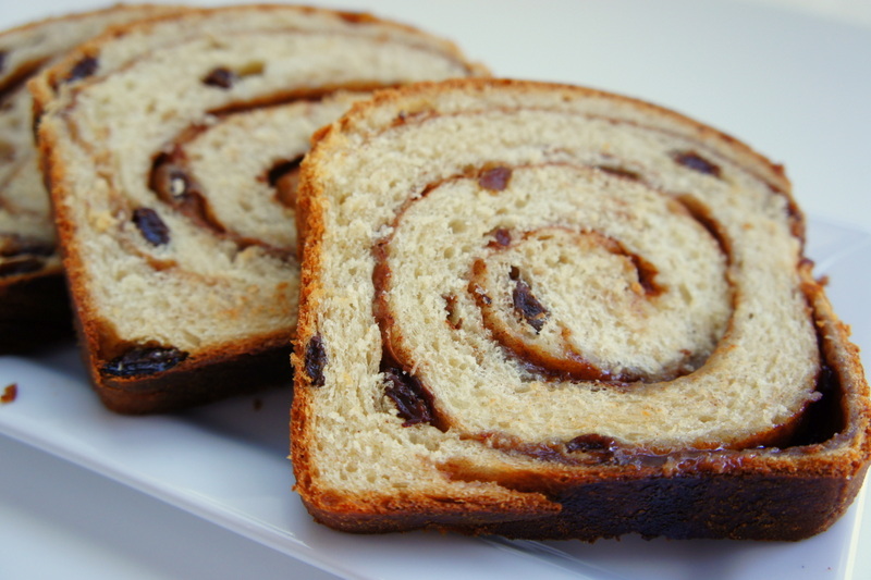 • Duas fatias de pão com passas em espiral na travessa branca