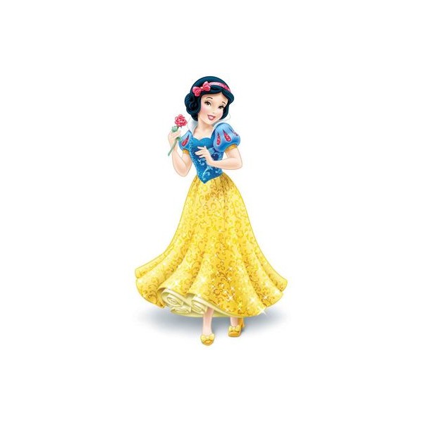 • Figura da Branca de Neve com vestido azul e amarelo segurando uma rosa