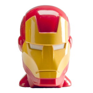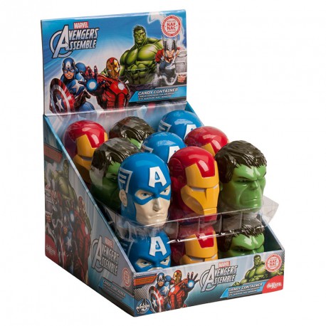 • Recipientes de doces em formato de cabeças de Capitão América, Homem de Ferro e Hulk em expositor da Marvel Avengers