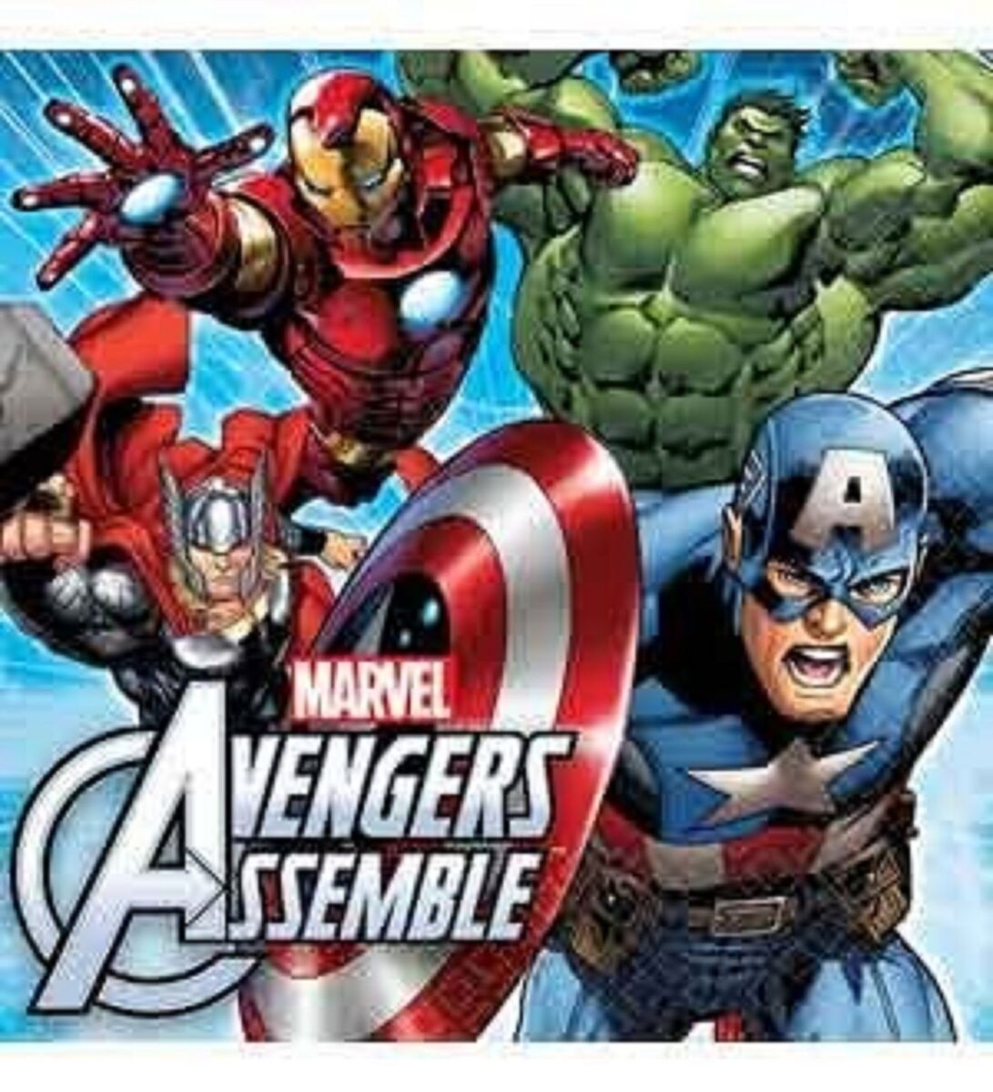 • Ilustração dos personagens dos Vingadores da Marvel com texto MARVEL AVENGERS ASSEMBLE
