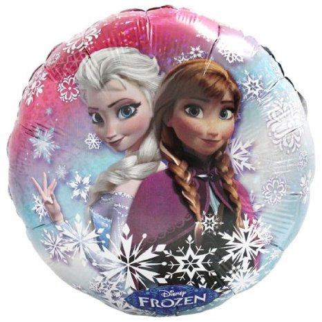 Balão redondo com personagens Elsa e Anna do filme Frozen em fundo com flocos de neve