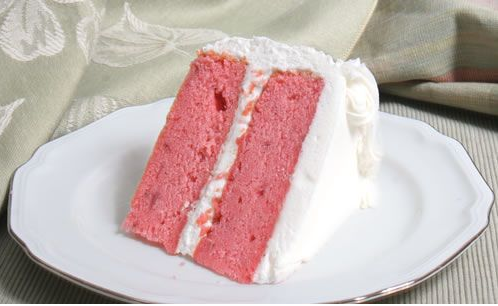 • Fatia de bolo cor-de-rosa com cobertura branca num prato branco com borda prateada