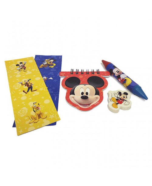 Conjunto de papelaria do Mickey incluindo marcadores de página, bloco de notas, caneta e borracha.