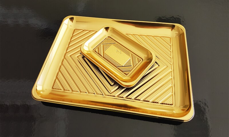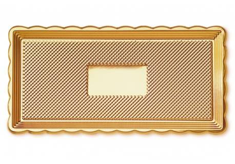 • Tabuleiro retangular dourado com padrão texturizado e bordas onduladas