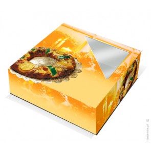 • Embalagem para bolo-rei amarelo-laranja com janela transparente e imagem do bolo