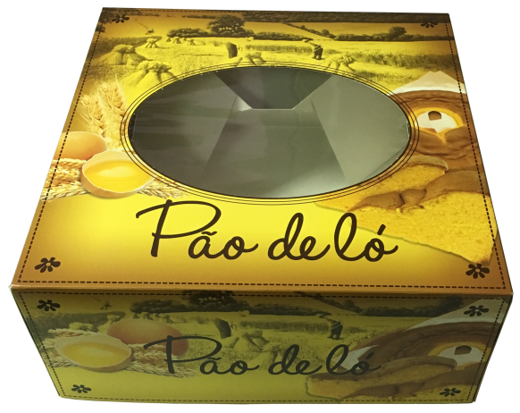• Caixa amarela de Pão de Ló com janela transparente e ilustrações de ingredientes