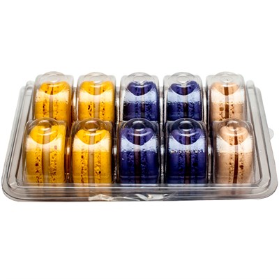 • Caixa plástica transparente com 10 macarons amarelos, azuis e bejes organizados em duas fileiras.