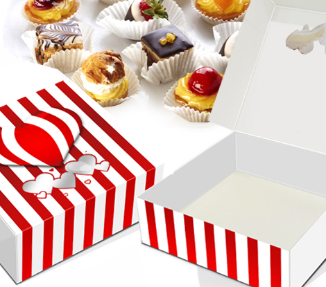• Caixas de embalagem brancas com riscas vermelhas junto de pastéis pequenos variados em forminhas brancas