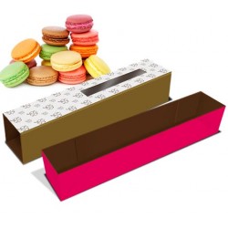 • Caixa de embalagem retangular bege e rosa com macarrons coloridos ao lado.